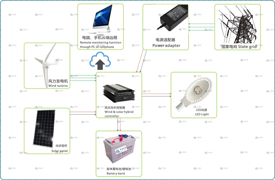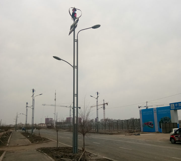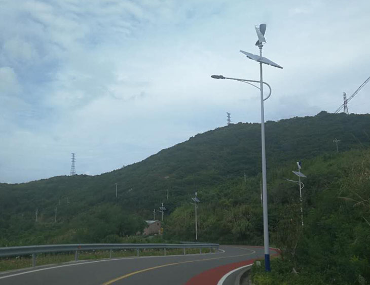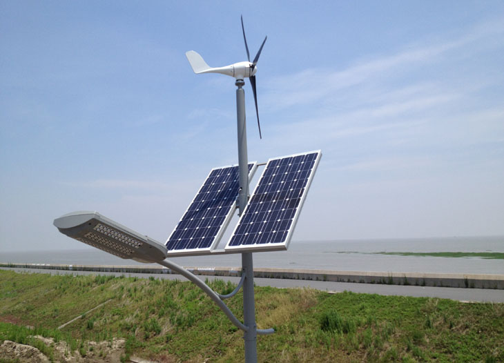 采用風能和太陽能提供能源點亮路燈的一種新能源供電路燈,無需外接市電網,能自動控制路燈的開關和亮度。可有效降低石化能源帶來的碳排放,同時能起到良好的科普和景觀作用。特別適合于不方便市電供電而又需要路燈的路段。